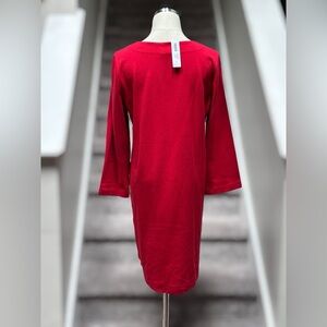Brand new with tags. This vibrant red shift dress features stunning black beaded embellishments along the scoop neckline for an elegant touch. Crafted from a soft cotton blend with stretch for comfort and ease of movement. A timeless, versatile piece perfect for parties, holidays, or special occasions.