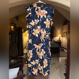 A stylish floral maxi dress from NY & C featuring a vibrant floral pattern on a navy background. This dress is perfect for casual outings or summer events. Thick linen material. New with tags.