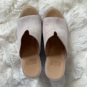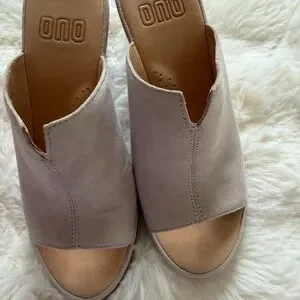 Super comfortable and stylish OUO wedge mules in a soft blush-taupe suede. Slip-on design with peep toe and cushioned leather footbed! New without tag. 💖
