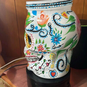 Sugar skull hand painted base no lid measure 7 inches tall mount top is 4 inches opening can be used like a base or a light in there whichever you like