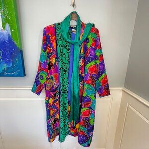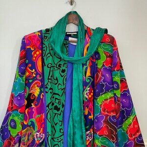 Statement vintage Maggie Shepherd kimono 3 piece set featuring a bold multicolor abstract print with vibrant jewel tones of purple, teal, green, red, and turquoise. Lightweight, flowy duster silhouette with a button front, pockets and long sleeves, perfect for layering. Styled with a rich royal blue underblouse that complements the saturated color palette, plus a thin detachable scarf that adds movement and versatility. Artistic, expressive, and effortlessly chic—this set embodies wearable art with a timeless vintage feel. Ideal for resort wear, gallery looks, or elevated everyday styling.