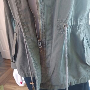 Chic utility jacket with studded shoulder details. Drawstring waist for a tailored fit. Perfect for casual outings.