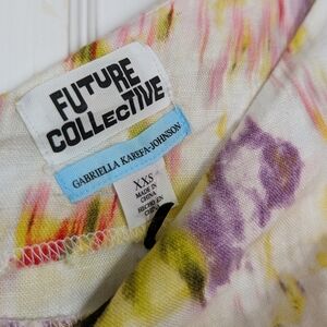 NWT Future Collective x Gabriella Karefa-Johnson one-shoulder dress in a colorful abstract print. Features one long sleeve with ruched/drawstring detail. Linen/rayon blend.
