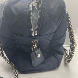 Stylish Prada shoulder bag in a quilted design. Features elegant silver chain straps. Perfect for any occasion.