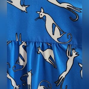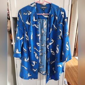 Small/medium Modcloth "breezy bliss kimono," bright cobalt blue with white cat print. GUC.
