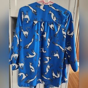 Modcloth S/M Blue White Cat Print Breezy Bliss Kimono Cover-up Silky Blouse