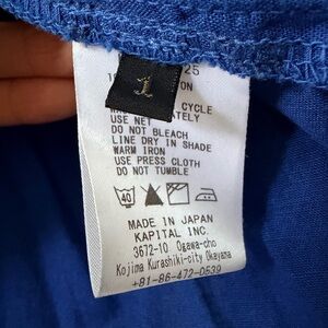 Stylish button-down shirt by Kapital. Features a unique blue design with tie-dye accents. Perfect for casual wear. There is some yellowing on the white part near the neck. The shirt is clean, but I haven’t worn it in a few years and other than that it’s in excellent condition. I bought it in Japan.