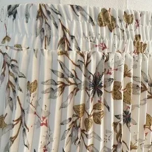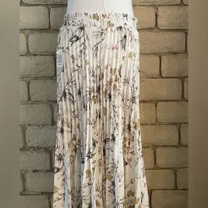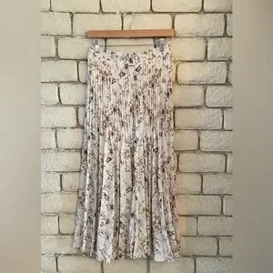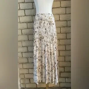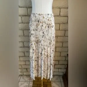 White floral long pleated skirt with a wide elastic band. Flowy and comfortable great to pair with your favorite fall boots. Size medium