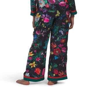 DALIA MACPHEE Black Satin Floral 2 pc Notched Long Sleeve Pants PJ Set