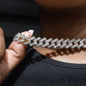 This stunning silver necklace features a dazzling array of diamonds, perfect for adding a touch of elegance to any outfit.
