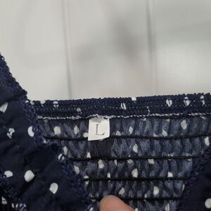 Navy spaghetti strap dress with white polka dots, Searsucker Gathered,size Lg.