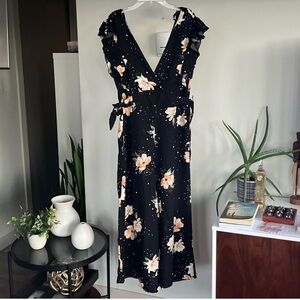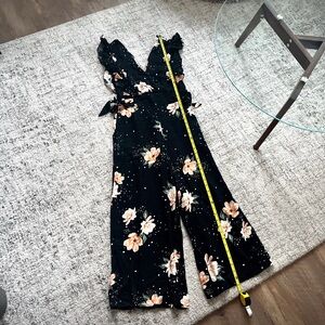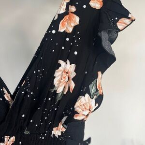 Elegant black jumpsuit with floral design, perfect for any occasion. Features a flattering V-neck and ruffled sleeves for a chic look.