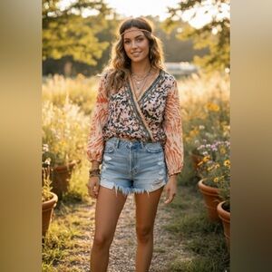 Elevate your bohemian style with this stunning NWT (New With Tags) Free People blouse! This unique top features a relaxed, cropped silhouette with a cool mixed-media design, combining a dark floral back panel with orange and pink tie-dye sleeves and a plunging surplice V-neck front (when worn as intended). It's the perfect statement piece for any casual outing.
