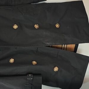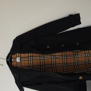 Sleek black trench coat by Burberry. Features signature check lining. Ideal for sophisticated style.