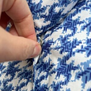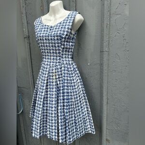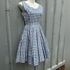 Vintage 1960’s hand made Oversized Houndstooth Patterned Dress & matching jacket. Stunning fit and flare silhouette. Stiff lining that helps emphasize this shape along with detailed pleats. Zippered back entry. Matching button front peplum jacket. This was brought to me by a mom and daughter who were clearing out moms closet. This dress was hers. She labelled each garment with the year it was made. This is in very good vintage condition. There is a stain on the front that I only noticed when I was photographing. The arm pits have some discolouration as well. The right sleeve of the jacket is missing one button, left sleeve has 2 buttons. The garment is in excellent shape considering it is approx 60+ years old. Size is approx modern 6, measures; Jacket Shoulder 16” Bust 17.5” Length 19” Dress Shoulder 12” Bust 16” Waist 13” Hip 28” Length 37”