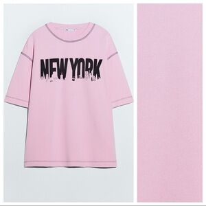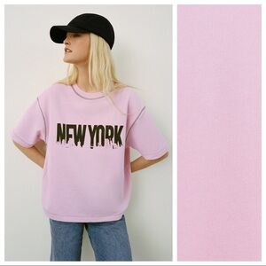 NWT. Zara Pink "New York" Print Sweatshirt with a round neckline, short sleeves, front slogan detail and contrast topstitching. Size S. Ref. 1443/006. Pit to pit 21,5" flat, shoulders 19", sleeves 8", length 24,5".1009