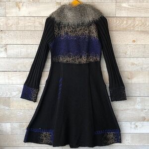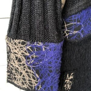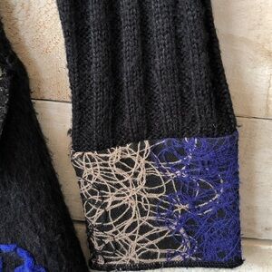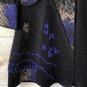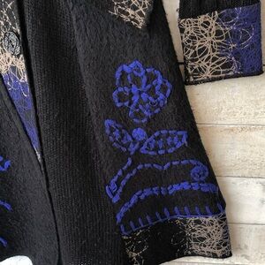It is a gorgeous black ribbed sleeve knit duster with embellished with cobalt blue embroidered flowers