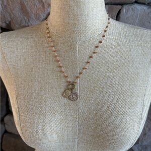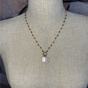 This elegant necklace features delicate beads and bronze charms, perfect for adding a touch of sophistication to any outfit.