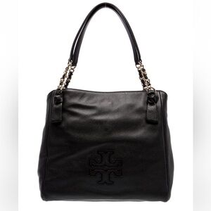 Elegant black leather tote. Features chain and leather handles. Iconic Tory Burch logo detail. EUC with no callouts.