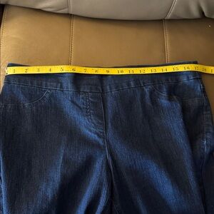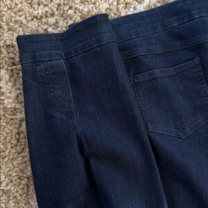 Classic navy denim jeans. Ideal for everyday style. Elastic pull on jeans. Mock side pockets. Two back pockets. Never worn. Measurements are in photos