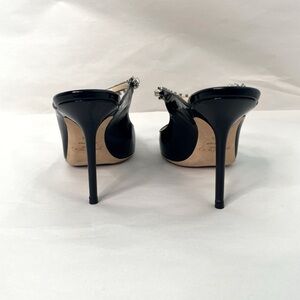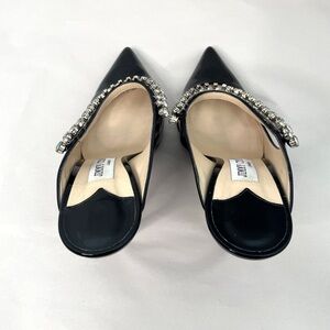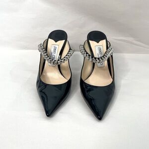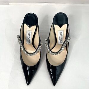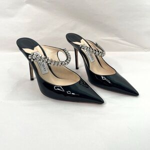 In excellent condition Jimmy Choo Patent Leather embellished crystal Bing 100 Heels. Bottom soles have normal wear.