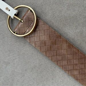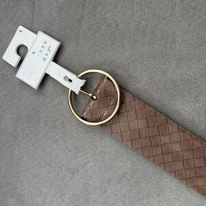 Elegant brown belt with woven texture. Features a gold round buckle. Perfect for any outfit.