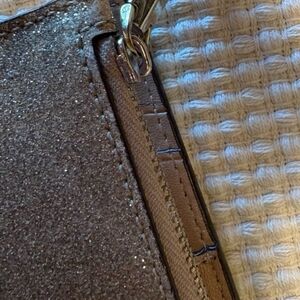 Shimmer with style using the Kate Spade gold glitter wristlet. Perfect for adding a touch of sparkle to any outfit. Minor rubbing. Good overall condition.