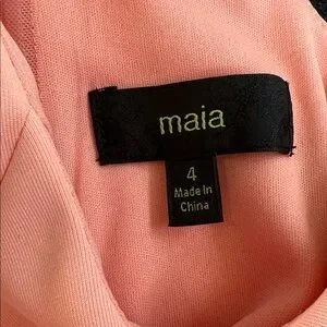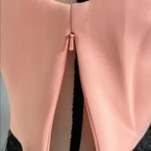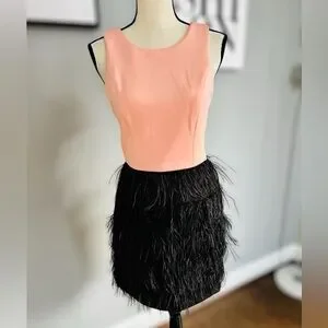 This sleeveless mini cocktail dress features a smooth peach or blush pink top and a black feathered skirt, snap and zipper side closure, and an open back with black tie detail.
