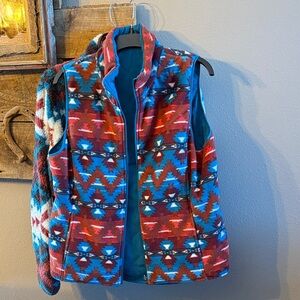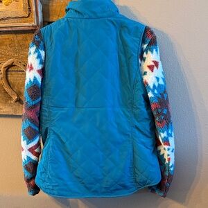 Teal quilted reversible vest with front pockets - size large I believe. Pullover is fleece/sherpa type material with teal, rust, white and red pattern - size Medium. Features Ariat logo. Perfect for layering.