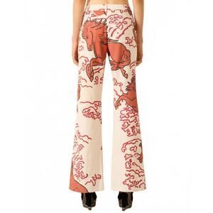 Step into elegance with the Women's Bunny Rouge Pegasus Pant by ALIX OF BOHEMIA, crafted from hand-loomed Khadi cotton with a striking off-white base and large-scale mythical horse motif. These high-rise, regular fit pants feature a flared leg and a unique handmade button closure by ceramist Daphné Verley. Designed with practicality, they include pockets and a zip closure, blending artisan craftsmanship with everyday wear. Perfect for summer evening events, these pants embody the beauty of handcrafted textiles, making each piece distinctively special.