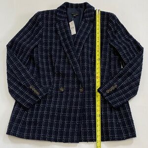 Ann Taylor Navy Plaid Blazer. An elegant double-breasted blazer with with four-button cuff accents. Perfect for office wear. Very classy wardrobe staple. Please see pictures for more details and measurements.