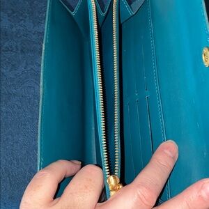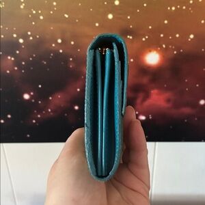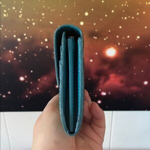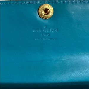 GUC - Metallic teal monogram vernis wallet with gold-tone hardware. By Louis Vuitton.