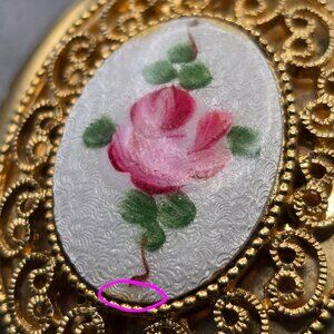 This vintage Avon locket features a hand‑painted pink rose over guilloché‑style enamel, framed in ornate gold‑tone filigree. The long 32" ribbed anchor chain adds elegant drape, making it perfect for layering or wearing as a statement piece. A romantic keepsake with timeless charm and beautiful craftsmanship.