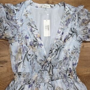 NWT Aura Blue Floral Tie Front Mini Ruffle Dress - Size Medium Short Sleeve