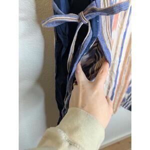 Beautiful Mata Traders dress featuring a vibrant handcrafted vertical Ikat stripe pattern in rust, blue, and cream. Unique navy side panels with adjustable ties allow for a custom, flattering fit. Includes a round neckline, back keyhole closure, and deep side pockets.