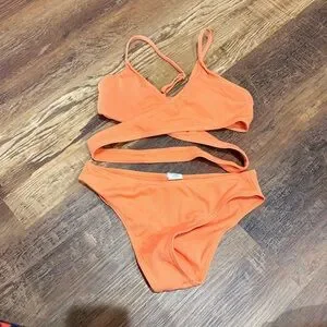 Stylish orange bikini set. Features criss-cross design. Perfect for beach days. Could be worn by small adult or teen.