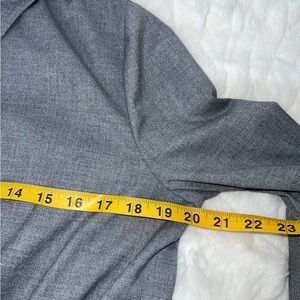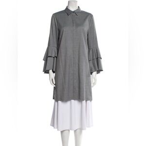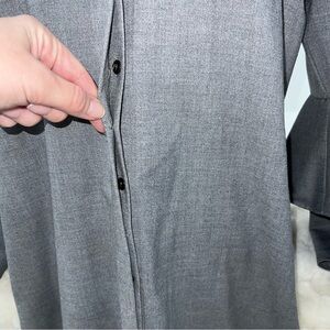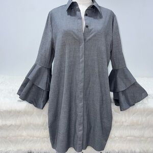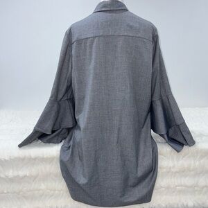 Very versatile piece, dress up in many ways. Size L. Please see photos for measurements. Stylish charcoal top with dramatic flare sleeves. Perfect for any occasion.