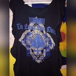 SALVAGE Rare blue rhinestone "To Each His Own" black graphic sleeveless hooded mini dress. Perfect for casual outings. Fits sizes S-M stretchy