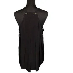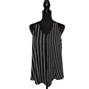 Polka Dot print sleeveless tunic top. It features a White Dot Pattern on a Back background, a V-neckline (or scoop neck), and a flowy silhouette.