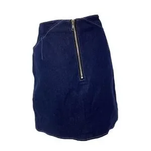 Denim mini skirt in Sunset Blue featuring a front laced panel and an exposed back zipper. Sculpted with a slight A line silhouette.
