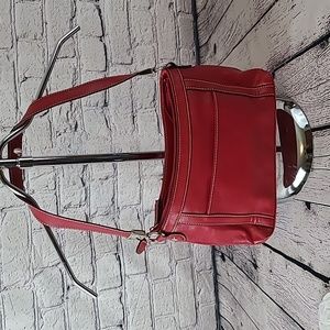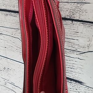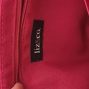 Liz&Co dark pink purse, 3 sections, center section zips closed with 2 slide pockets and 1 zip pocket inside. 1 ouside slip pocket. Clean inside, don't think it was ever used. Measures approximately 12" across, 7" deep and 3" wide at bottom. Excellent condition, smoke free home.