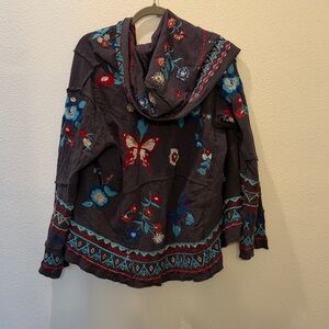 Stylish embroidered hooded jacket featuring vibrant floral patterns. Perfect for adding a pop of color to your wardrobe.