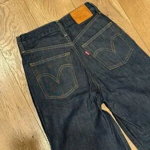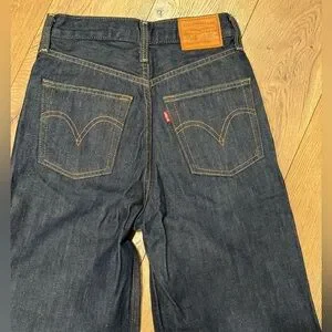Women’s Levis premium W25 L34 classic dark blue ribcage wide leg jeans. Perfect for any occasion, these jeans offer comfort and a timeless look. These are such cute jeans, soft denim and super comfortable.