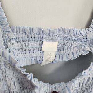 Elegant sky blue smocked dress with ruffled details.