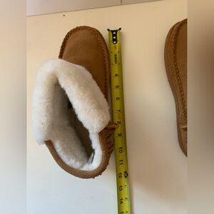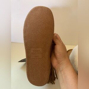Cozy Muk Luks slippers for kids. Soft tan exterior with plush white lining. Perfect for warmth and comfort.
