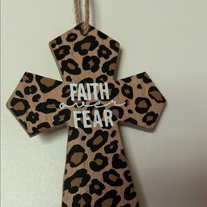 Leopard print cross wall hanging with 'Faith Over Fear' text. Perfect for home decor. 5 1/2” length by 4” width.