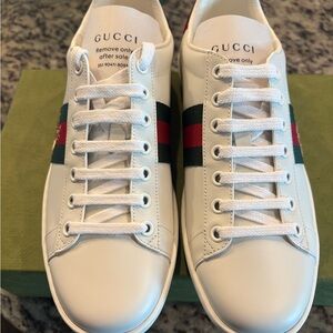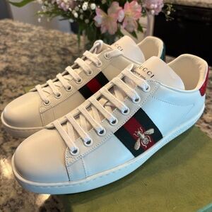 Stylish Gucci sneakers in white leather. Features iconic red and green stripe with bee emblem.