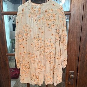 Lightweight long sleeve tunic dress showcases a delicate floral print in soft peach and yellow tones over a sage green background. Designed with a relaxed babydoll silhouette, it features a split neckline with a dainty tie closure and long sleeves with elasticized cuffs. The tiered skirt adds gentle volume, making it a versatile piece for transition seasons or casual outings.