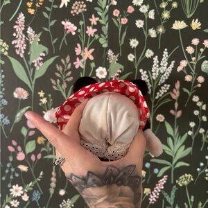 Details: Hard plastic eyes, iconic red dress with white polka dots, white gloves, and yellow shoes.