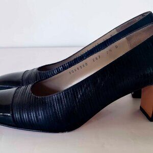 Salvatore Ferragamo BLK Illusion Stripe Fabric Patent Leather Captoe Pumps 7.5B